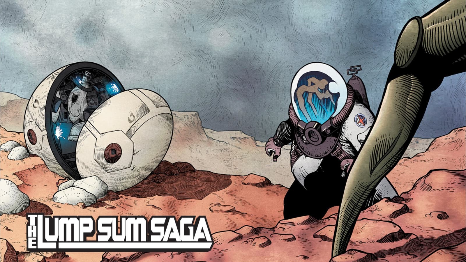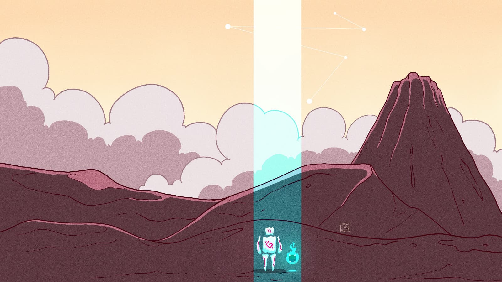 Series of landscape illustrations featuring a golem-like character called the Chronicler.